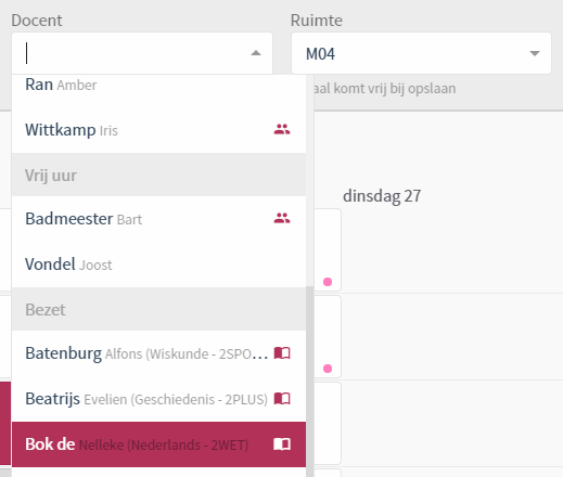Als de docent die aan de les gekoppeld is afwezig is ziet u in de bovenste balk dat er bij docent uitval geselecteerd is. Als u niets doet of deze les zo opslaat valt deze les uit na het publiceren. Klikt u op de docentkeuze dan ziet u alle mogelijke opties voor deze les.