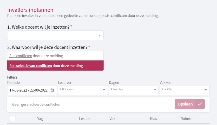 Let op; bij het selecteren van een invaller wordt er geen rekening gehouden met de beschikbaarheid van die invaller. De invaller wordt voor alle (geselecteerde) conflicten ingepland.