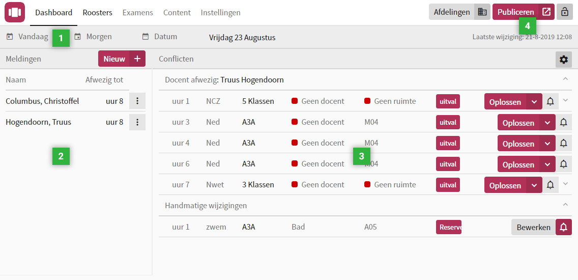 Met deze knop bevestigt u de gemaakte wijzigingen en publiceert u (een selectie van) de getroffen lessen. Zolang u conflicten niet publiceert, zijn deze conflicten alleen zichtbaar voor gebruikers in het Classie Dashboard en dus niet in de apps of monitoren.